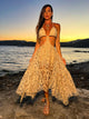 Vestido longo em tule estampado de abacaxi em estilo boho chic . A peça por baixo é um macaquinho com forro de malha e bojo. O macaquinho possui regulagem nas alças. O vestido sobreposto em tule de manga longa contém dedal que dá um toque fashionista à peça. Na altura do quadril possui um drapeado que deixa o vestido ainda mais lindo. É um vestido que brinca com transparência e sensualidade.